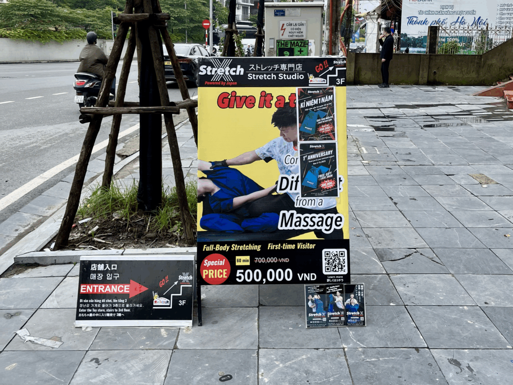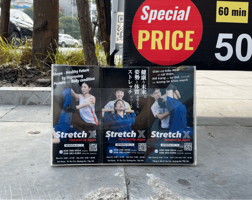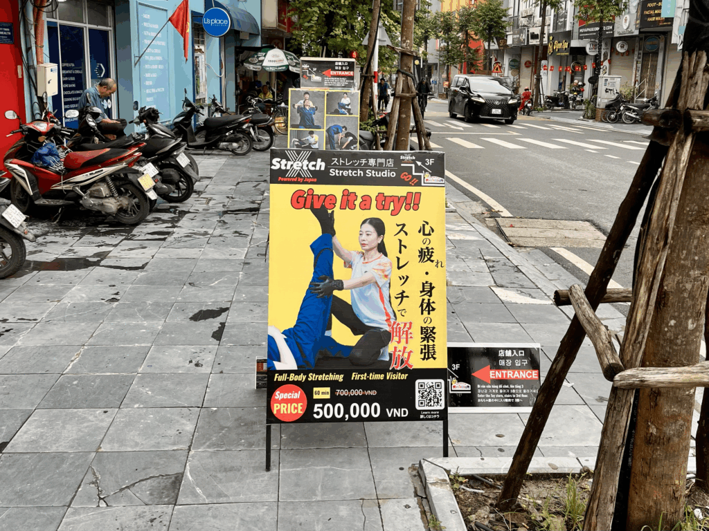 - 店舗前を通る人に 「ここにストレッチ専門店がある」 と気づいてもらい、来店のきっかけをつくるため。