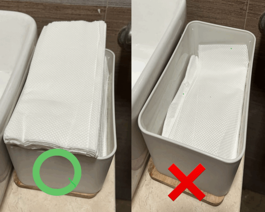 - 消耗品: トイレットペーパー2ロール設置する、手拭き用ペーパータオルを満タンに補充する